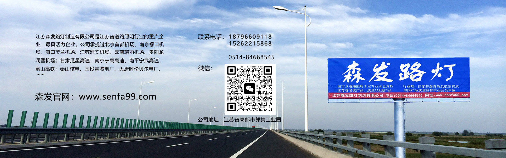 江蘇森發(fā)路燈制造有限公司是江蘇省道路照明行業(yè)的重 點企業(yè)。公司承攬過北京首都機場、南京祿口機場、海口美蘭機場、江蘇淮安機場、云南瑞麗機場、貴陽龍洞堡機場、珠海金灣機場、贛州黃金機場、江蘇新沂機場;甘肅瓜星高速、南京寧高高速、南平寧武高速、福建韶光高速、天津薊汕高速、貴州安江高速、昆山高鐵;秦山核電、福建霞浦核電、國投宣城電廠、大唐呼倫貝爾電廠、大唐803電廠、邵陽寶慶電廠、蘇州望電電廠、安徽廬江電廠、長治王曲電廠、國電湖北漢川電廠;福建莆田港、山東蓬萊港、江蘇太倉港、唐山曹妃甸港;福建武夷山風(fēng)景區(qū)、江蘇吳江東太湖風(fēng)景區(qū);塔里木油田油罐區(qū)、青海鹽湖集團、北京工業(yè)大學(xué)、武漢通用制造基地、黑龍江濃江農(nóng)場、江西星火有機硅項目;及國內(nèi)眾多城市道路亮化項目。